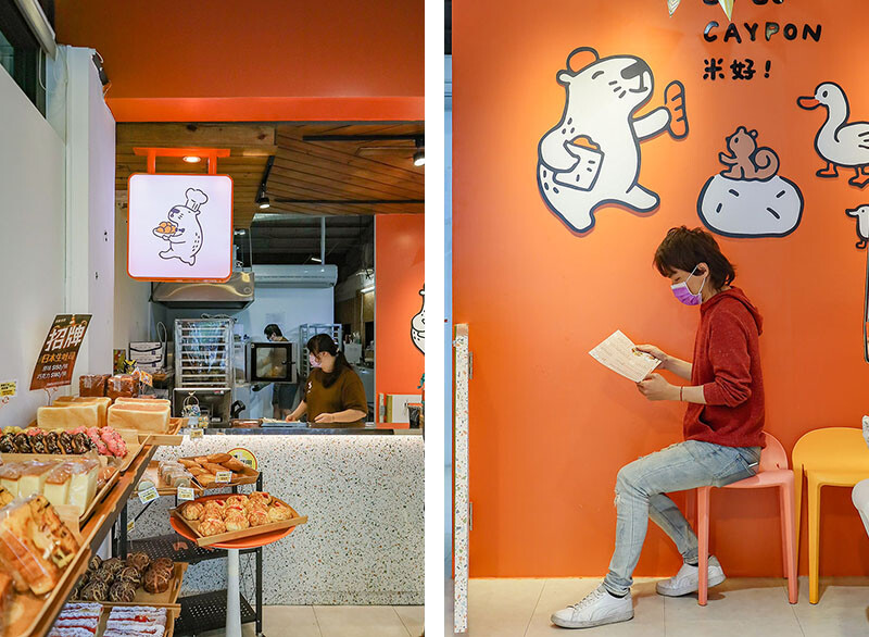 麥胖就是賣麵包的意思啦,水豚波波頂著橘子自顧自的眼神相當可愛;我喜歡另一側帶點鄉村風的窗台牆面,上面正在忙活的波波正在烤麵包呢~