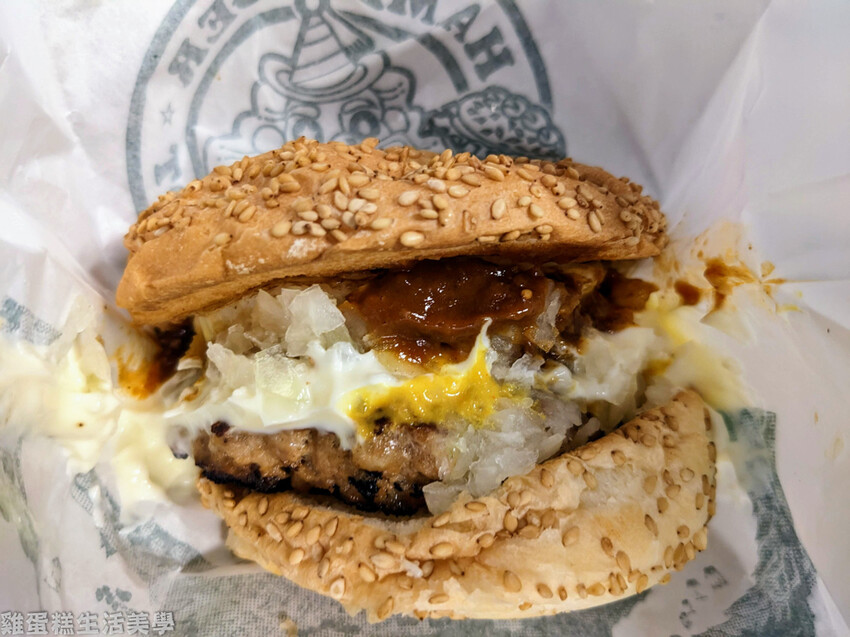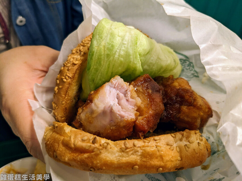 ▲荷包蛋漢堡 490日圓,這款是人氣第二名的漢堡,內有一整顆荷包蛋和豬排漢堡肉,漢堡內有碎油蔥和豬排醬也是很夠味,但跟招牌的中華雞腿堡口感差很多。