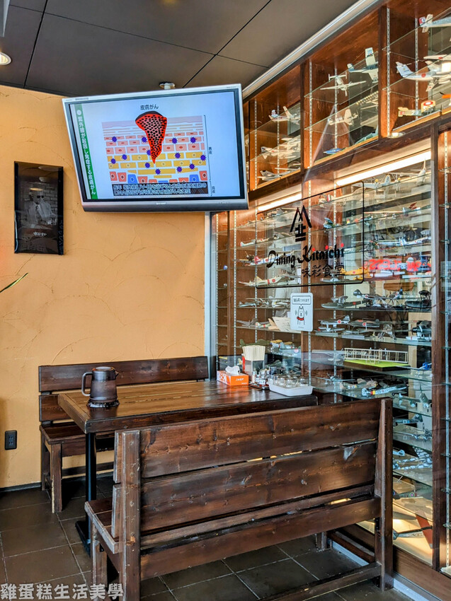 ▲一、二樓皆有用餐空間,座位旁的隔間有透明展示櫃,展示著各種飛機模型。