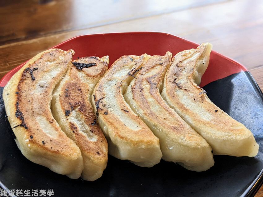 ▲煎餃一份有五顆,底部煎得微焦份量很大,內餡飽滿多汁很有飽足感。