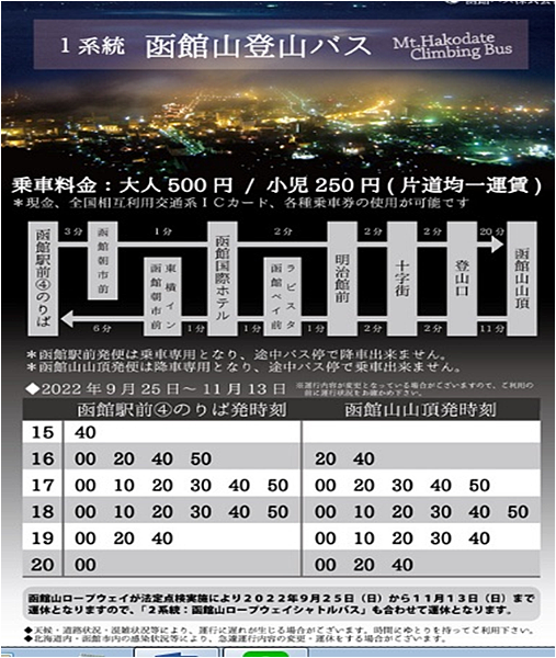 函館山夜景是來北海道必看的三大夜景之一,交通方式有兩種,搭乘路面電車在十字街下車,再轉搭纜車上山,也可乘坐1號公車直接登頂。