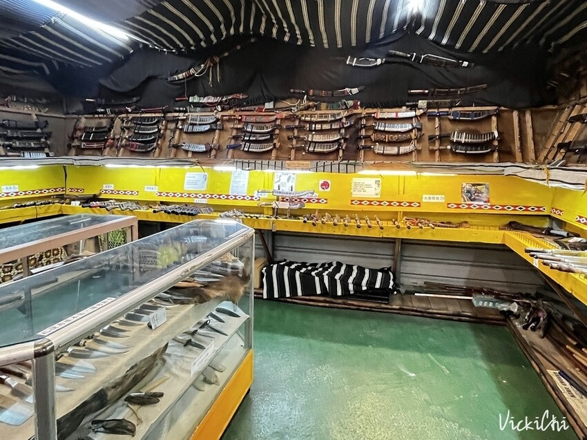 店內展示7族的原住民所使用的山刀,每一族的原住民所使用刀具都不相同。銅門刀的特色,在於是纏在握柄上的刀繩,纏繞出普普藝術的風格。除了美觀外,增加握持的舒適感與用刀時的穩定性。在野外需要用到繩子時,可以隨時將刀繩解下當繩子使用。