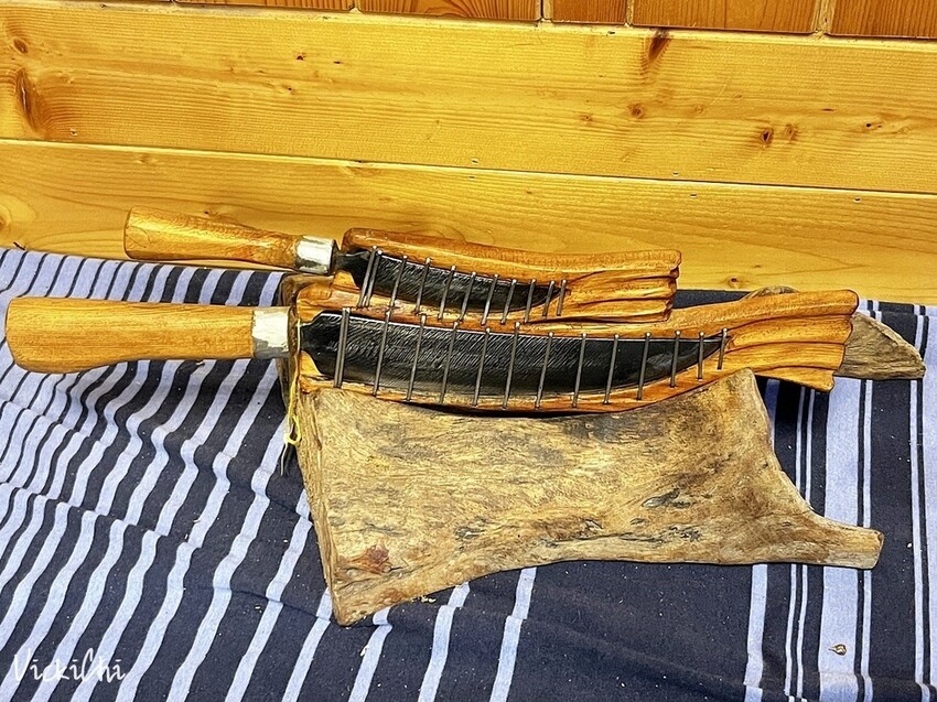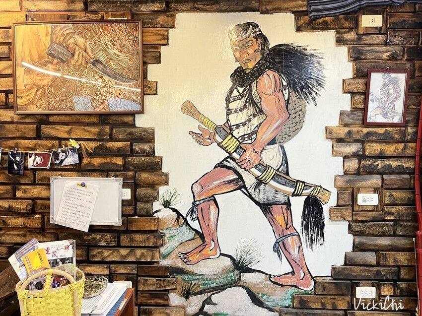 進入展示空間,吸引我的是櫃檯後面一幅太魯閣族族人拿著銅門山刀的壁畫,對太魯閣族來說,山刀特別重要,一句口耳相傳的話:「一把刀、一把鹽,就可以在深山生活。」由此可見,山刀在太魯閣族的日常生活是密不可分的工具,山刀除了用來克服大自然帶來的挑戰,也時常出現在日常生活及生命祭典儀式中。