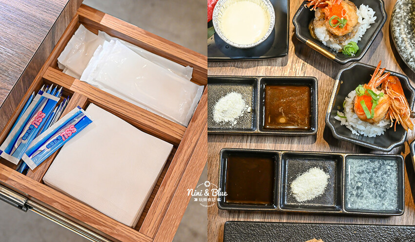 桌邊抽屜有面紙、濕紙巾、牙線棒,入座後會提供三種醬料,檸檬汁、昆布鹽、燒肉醬,基本上妮妮布魯是沒有什麼用到沾醬,但偶爾沾一下可以轉換味蕾感受。