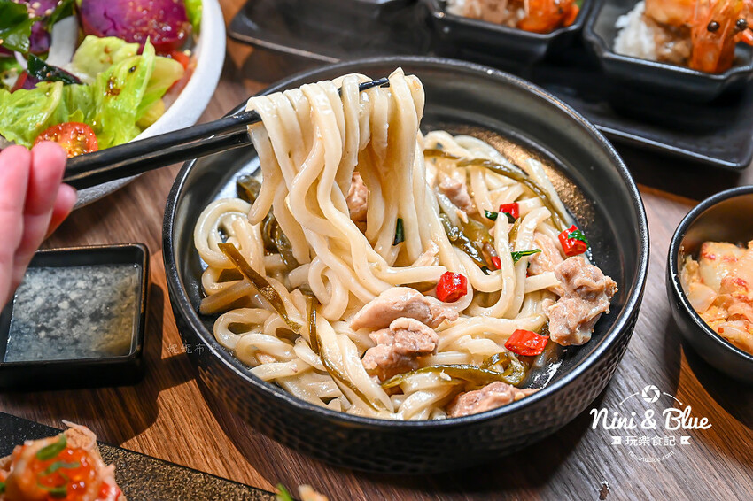 蒜香剝皮辣椒雞肉烏龍麵,加入許多蒜頭提味,再用剝皮辣椒給予甘甜感,但因為加入不少生辣椒,所以辣度十足,讓滑溜Q彈的烏龍麵條相當夠味,雖然很辣但滿好吃的耶!如果不吃辣又想吃烏龍麵者,可以選奶油明泰子烏龍麵喲!