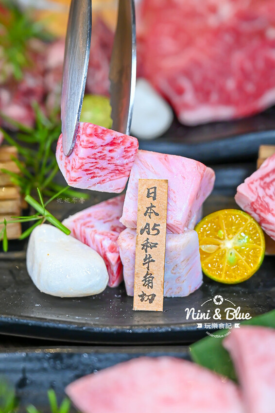 油花分布非常緊密的日本A5和牛小排,光是還沒烤之前就覺得很嫩~用大火烤個幾秒就可迅速起來,帶著粉紅色嫩度與油亮光澤,不用沾醬直接放入口中,超嫩甜~