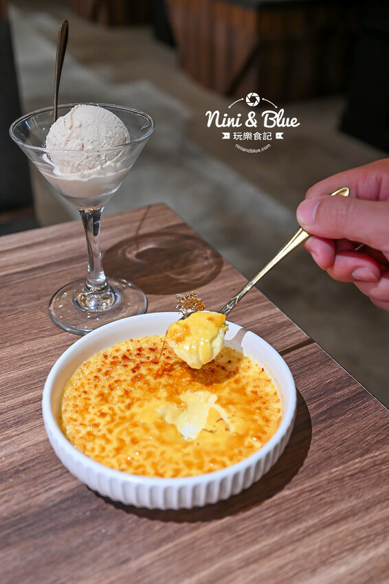 提拉米蘇口味的冰淇淋,有著像胚芽牛奶的感覺,濃郁香甜;烤布蕾在上桌時盤子還有點熱,敲開酥脆的焦糖外衣,裡面是很濃郁且帶有蛋香的嫩滑口感,布魯非常喜歡~