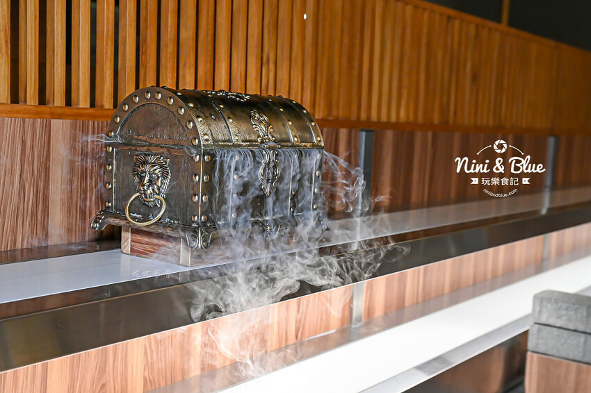 聽到鈴鐺聲響起,沁煙的古銅色霸氣寶盒隨著輸送帶傳送到桌邊,浮誇的白煙讓沿路的客人都投以注目眼光~如果你是來慶生、慶祝、想引人注意的就是把寶藏盒牛點起來啊! 如果是想求婚的,在裡面放戒指好像也是好主意(哈哈~我可不知道店家有無這服務喔~請電洽店家)