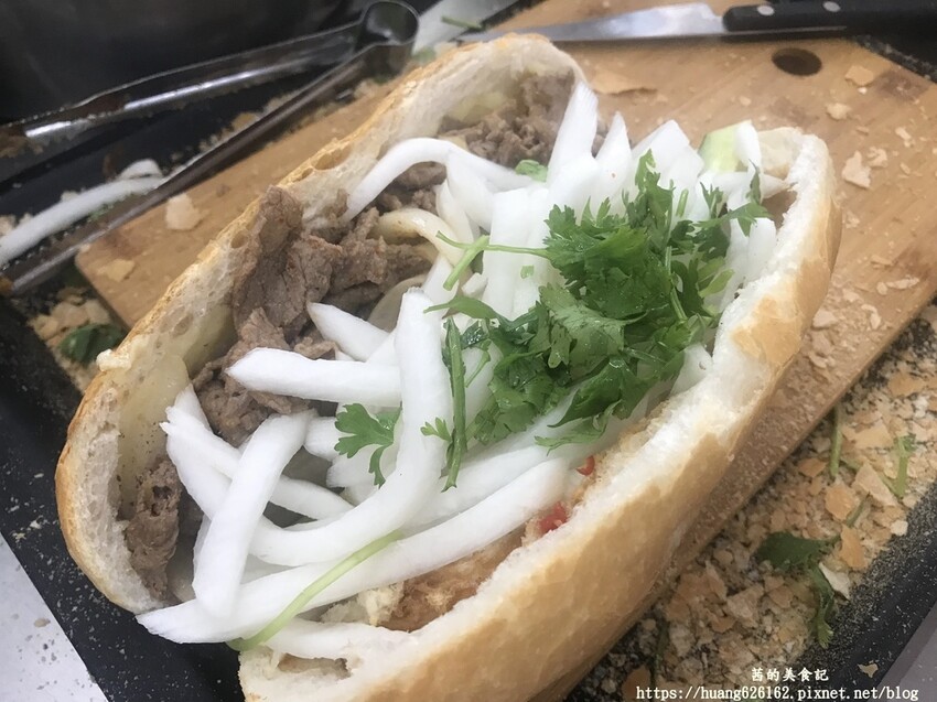 闆娘在製作越南手工麵包速度很快,茜才在拍照而已,他一個就製作完成放了主角牛肉、白菜頭、小黃瓜、香菜及生辣椒...等