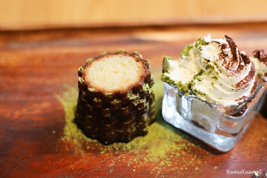 他們家的可麗露擺盤方式很漂亮耶~居然還附上奶油給我們搭配,以及兩塊白巧克力餅乾給我們配著吃!