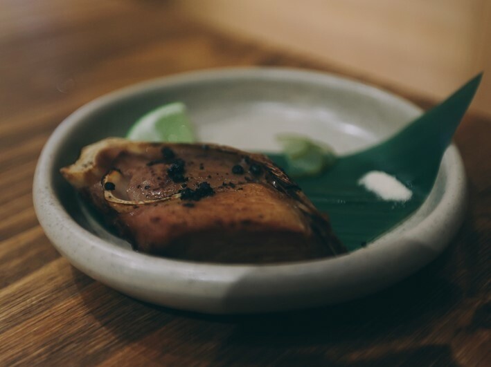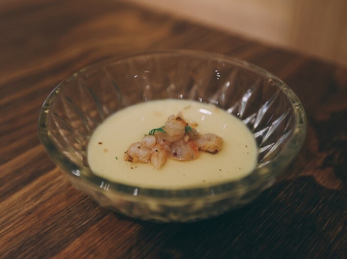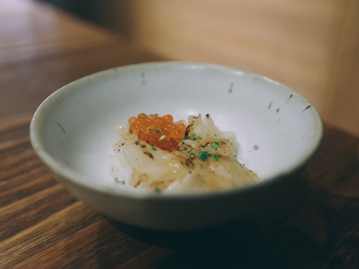 來自日本的蛋豆腐上放了松葉蟹的蟹肉和蟹膏,搭配醬油醃漬過的魚卵,淋上昆布高湯,隱隱的還帶股煙燻的香氣.