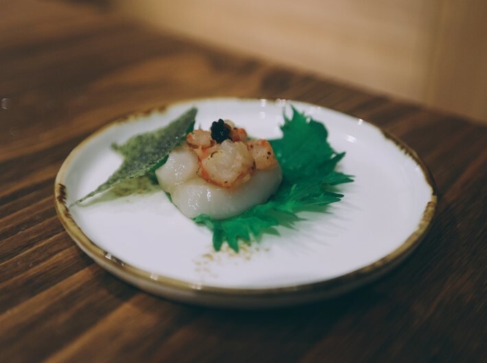 生食級的北海道干貝加上胭脂蝦和魚子醬就是一道大海的饗宴,包裹在紫蘇葉中再入口更是多了層次.最後在搭上自製的秋葵脆片.