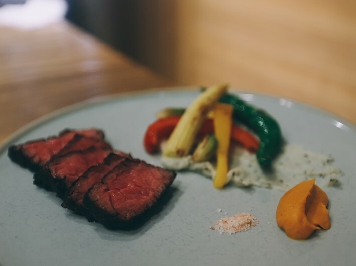 主菜三是宮崎牛.和牛翼板是很多人很喜歡的部位,因為油脂很平衡又軟嫩(我還是偏愛肥肥的部位啦!) 搭配奶油胡蘿蔔泥,胡蘿蔔泥做的是真的好吃,完全沒有原本那股青與澀….松露馬鈴薯泥也是水準之上,加上清烤的蔬菜沒過多醬汁,很不錯.