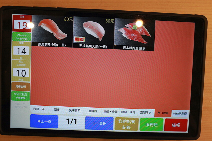 這裡點餐除了在迴轉台上自行拿取壽司之外,還可以透過這平板直接來點想吃餐點,小高直接把平板餐點拍照與各位分享,稍微看一下餐點很豐富定價很親民。