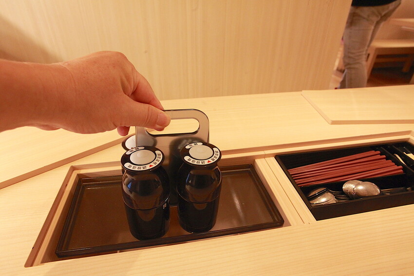 原來這佐料和餐具皆隱藏在桌底下,餐具有筷子、小湯匙、開瓶器、牙籤等,而佐料有醬油、醋及綠茶粉等。