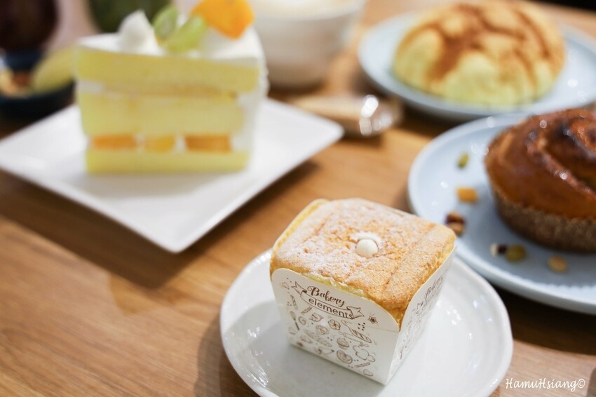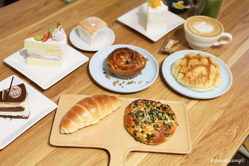 有"鹽可頌"."豆瓣蔥麵包"."酥皮菠蘿"."肉桂捲"."芒果切片蛋糕"."提拉米蘇"."四葉牛乳蛋糕"."芋頭戚風蛋糕".以及咖啡拿鐵"."紅龍果"與"羽衣甘藍"!