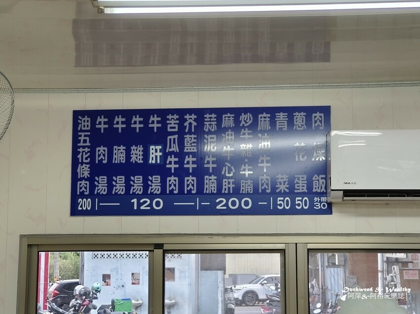 「阿榮牛肉湯」菜單寫在牆面上的看板,有基本牛肉湯及各式牛肉湯類牛雜、