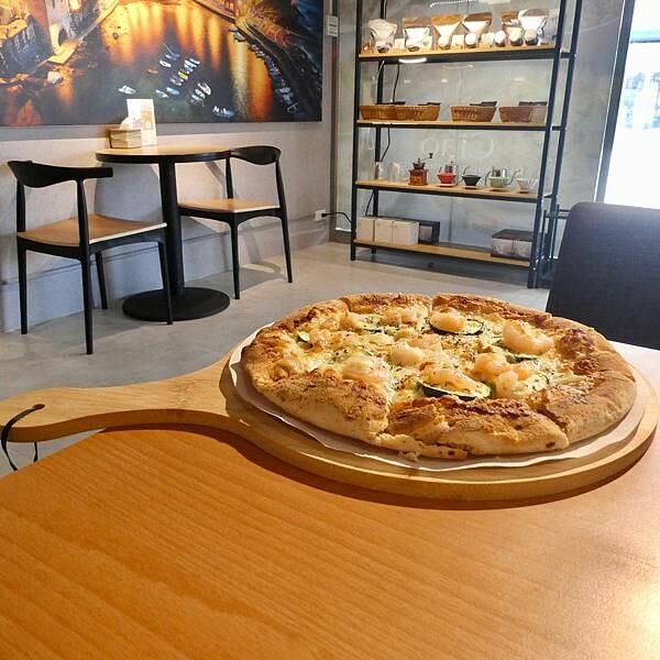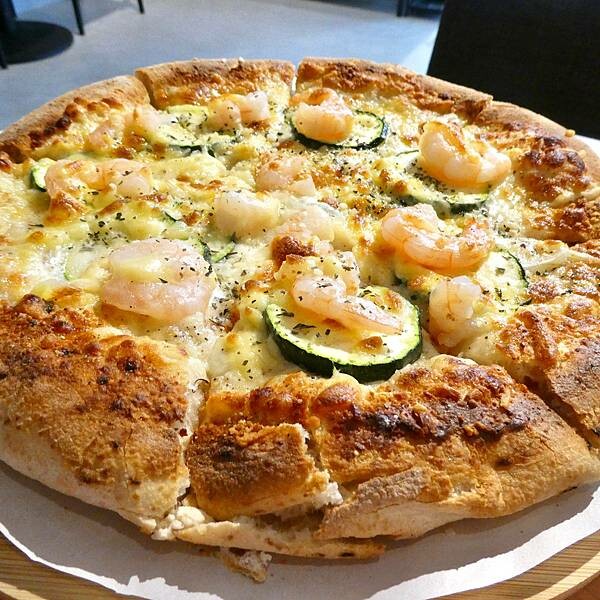 這個披薩,是我吃過最特別的披薩,他是屬於厚片,店家說披薩麵包是黑胡椒口味的,但其實我吃不出來,店家也說因為怕太辣所以黑胡椒沒有很多,披薩餅皮帶有麵包香氣,不是一般麵粉餅皮,烤得很酥脆,麵包香氣很濃郁,還有櫛瓜濕潤口感,很好吃,蝦仁很大也很大器的放很多蝦仁,新鮮好吃,搭配鹹感的還有麵包口感的披薩,不一樣的口感,我喜歡這樣的披薩。