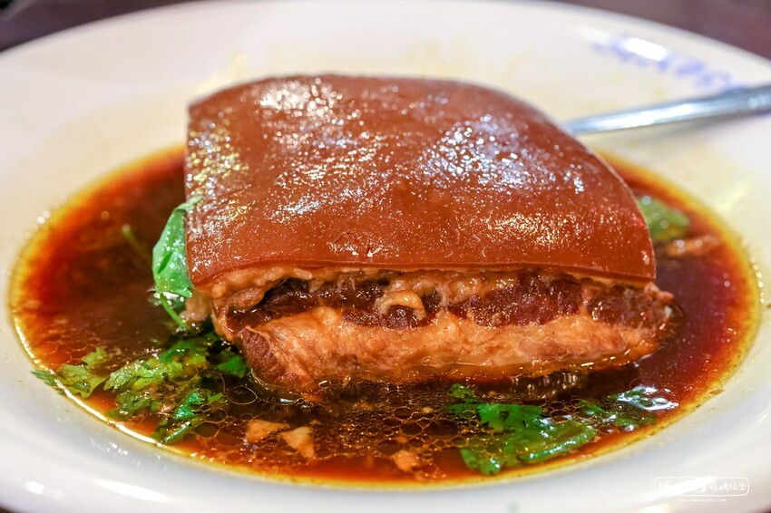 溫體黑毛豬腹料理的烘肉,看起來彈性十足的外觀,入味的焦糖色讓朋友們胃口大開,滑Q幾乎入口即化口感,看起來肥肉很多卻不會油膩,瘦肉的部份也處理得很好,一口咬下,多層次的風味,梅格說:好好吃啊!