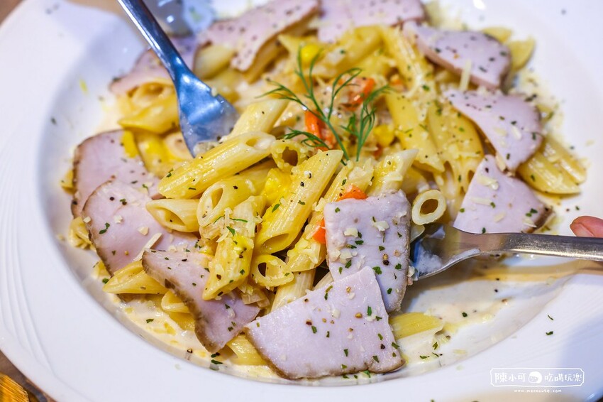手工製作的奶油白醬,散發濃郁風味,柔滑而不油膩。店家自製熟成火腿則帶有獨特的鹹香,口感略帶嚼勁,搭配上Q彈的尖麵,非常好吃呢!