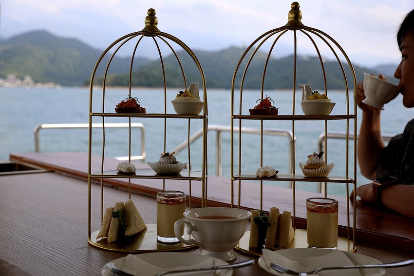 加上下午茶饗宴與超美日月潭湖面景緻 隨著潭面水波晃動搖曳 沁涼微風拂來 享受最舒適慢活的愜意時光