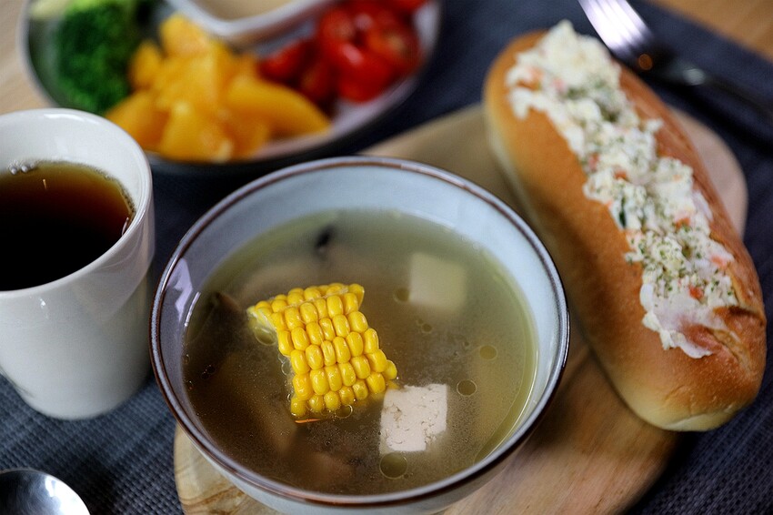 手作馬鈴薯蛋堡搭配熬煮入味的香菇玉米湯