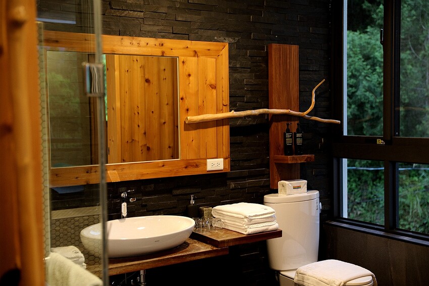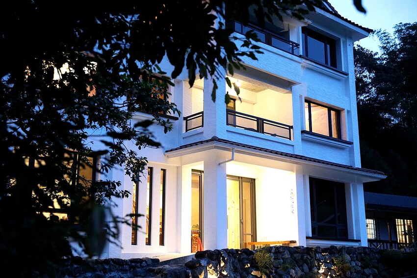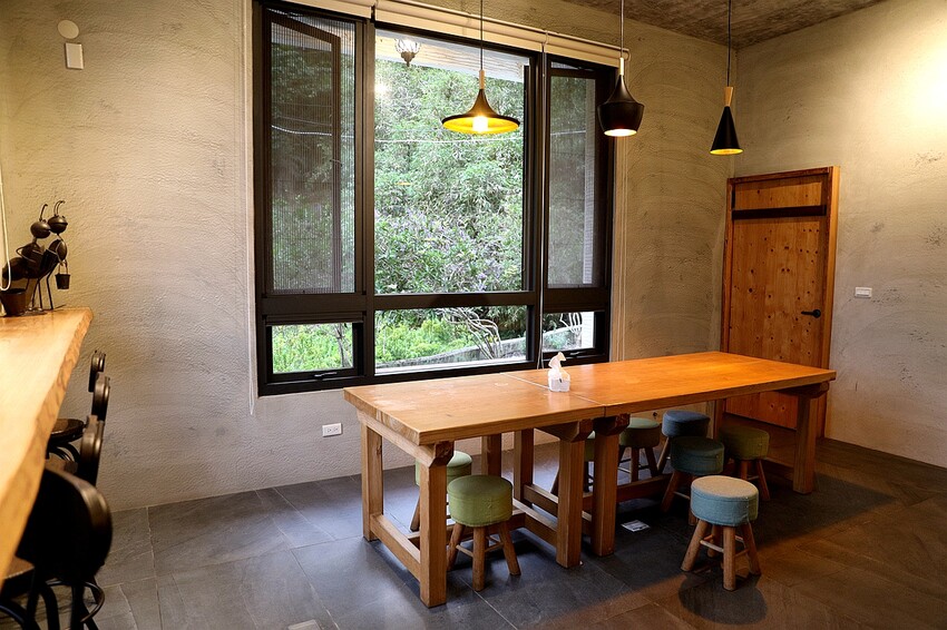 讓人來到此地有如隱居山林之中 民宿主人以大量清水模為建築主架構 大片玻璃落地窗