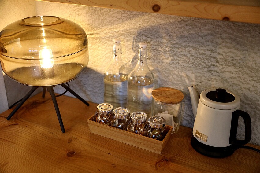 冰箱內有冷泡製成的日月潭紅茶另一側放了煮過的山泉水及各種日曬果乾可解饞 還有快煮壺可以燒開水