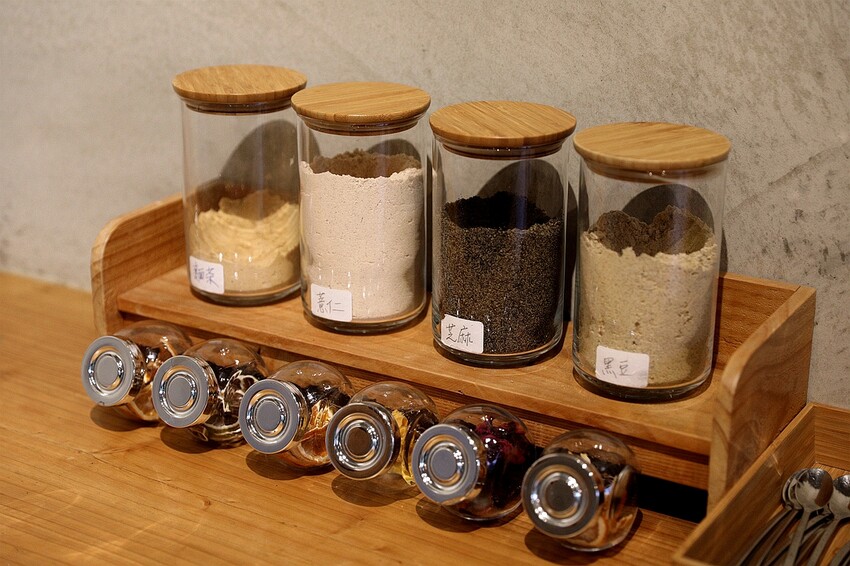 一旁吧台上還有麵茶、黑豆、黃豆、芝麻粉....等 可以自己泡來享用