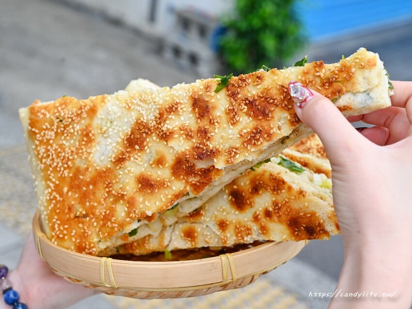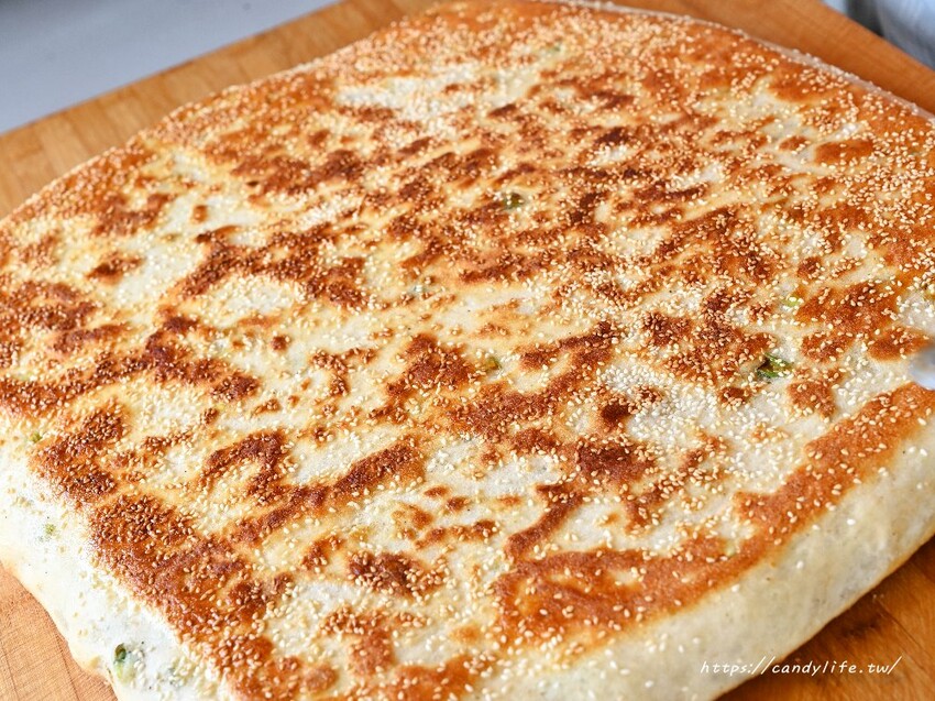 剛起鍋的的蔥花大餅就是讚,金黃焦香的外皮,口感相當酥脆,熱熱吃咬下去還會卡滋卡滋的,帶著迷人的芝麻香氣