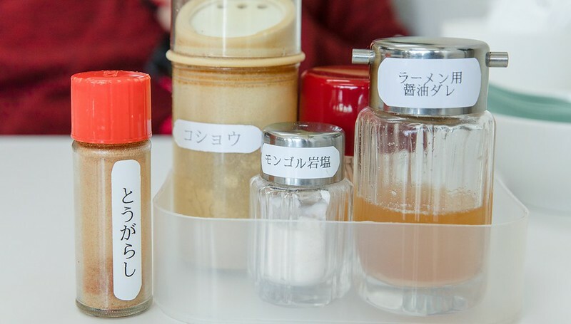 相對,如果你是重口味的,桌上還有一些調味料可以加,除了辣椒粉外、還有鳥取拉麵店的特色帶著中藥氣息的胡椒粉,這家居然還有蒙古的鹽,另外一瓶是拉麵專用的「醬油醬汁」(有一點鹹,別加太多)