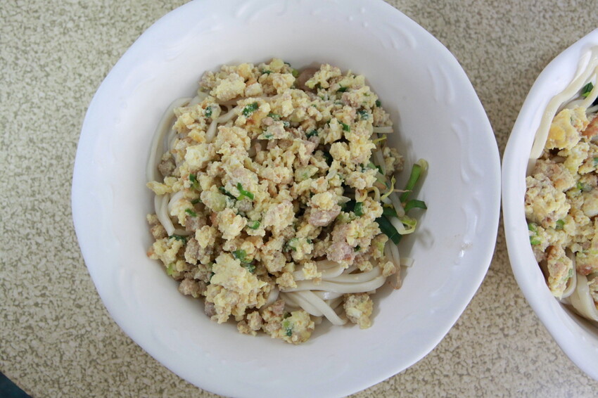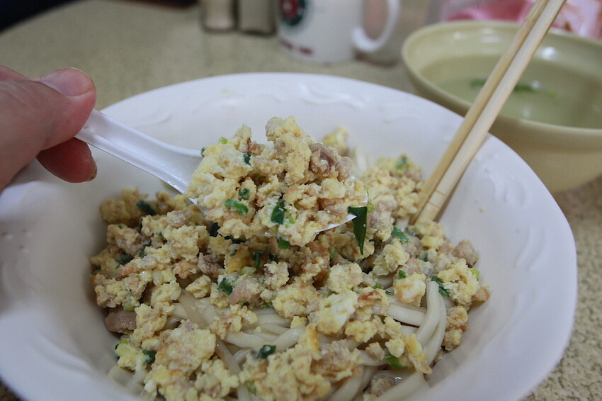 正碗麵組成很簡單表面滿滿炒蛋加荷包蛋,這炒蛋有添加肉末、蔥及韭菜下去拌炒,需要把蛋的焦香味炒出來才對味。