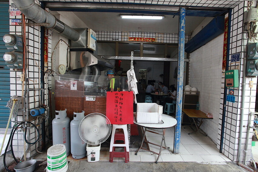 店外面道路搭起鐵皮來遮風擋雨,再在外頭放置洗手台當作洗碗場所。