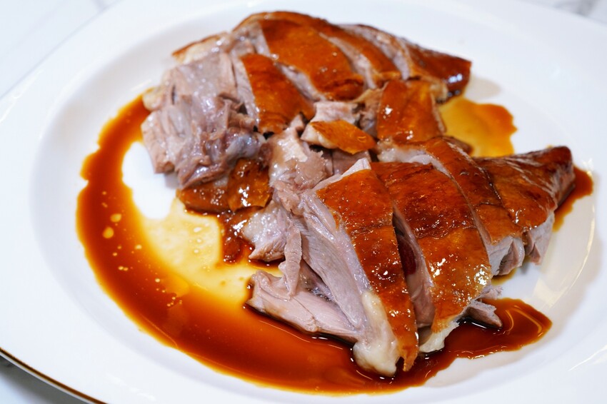掛爐片皮鴨選用至少養飼養 75 天、重達 3.5 公斤的櫻桃鴨,油脂豐厚,肉質最好、厚實多肉。入口之前先欣賞現場「桌邊片皮秀」,專業的服務人員用刀劃開油亮鴨皮,鴨皮、鴨肉的油香也隨之蔓延,邊看邊聞,口水吞不停。掛爐片皮鴨適合多人享用,人數不夠多時,可點「港式燒味拼盤」,也有鴨肉。