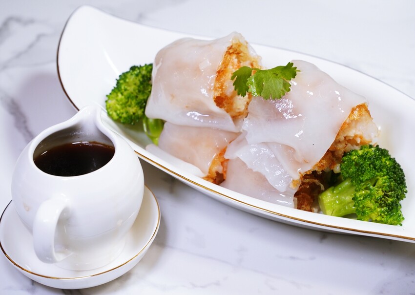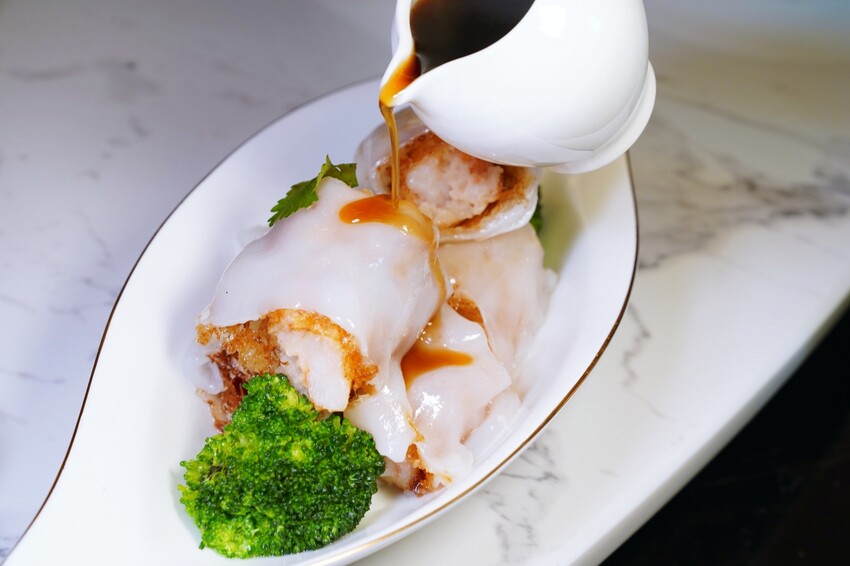 ▼腸粉入口滑腴,裹著脆皮海鮮漿捲,淋上微甜醬汁,吃得出蝦肉、花枝緊實 Q 彈感。