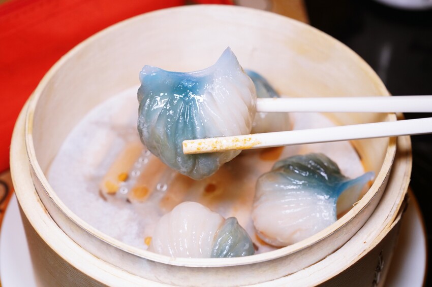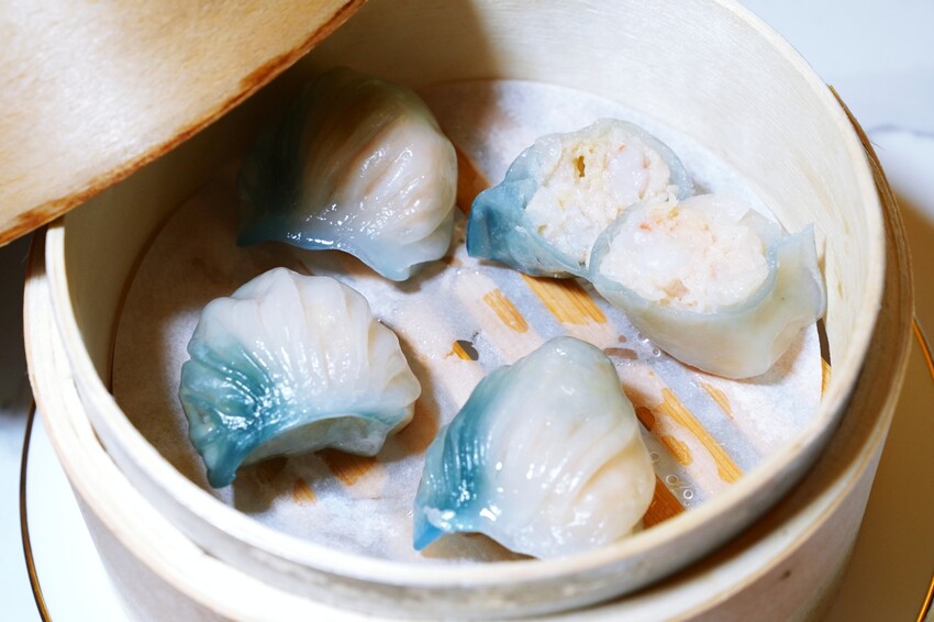 ▼鮮蝦餃外皮的漸層顏色來自蝶豆花植物色素,摺痕捏製得很漂亮,彈性十足的半透明麵皮微透出鮮蝦的顏色,麵皮包著肉漿與鮮蝦,脆彈口感充盈整個口腔。
