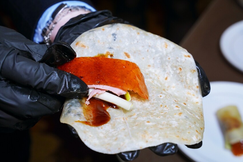 若手工餅皮包覆的鴨肉吃不過癮,片完鴨後會將剩下的鴨肉切成帶骨鴨腿肉,鮮嫩豐腴、多汁、無腥騷味,能吃得更過癮。