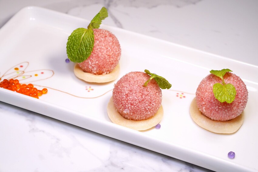 粉色外觀、薄荷葉裝飾是仿荔枝製作,擺盤有春天的浪漫氣息。