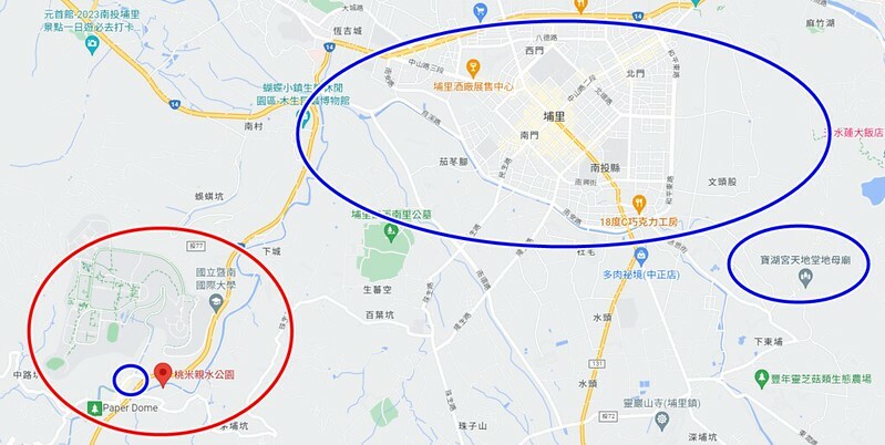「埔里桃米親水公園」位於埔里市中心,開車不到十分鐘左右的距離,附近還有著名的「妮娜巧克力城堡(紅圈中的小藍圈)」。另外,右下角的「寶湖宮天地堂地母廟」是這幾年埔里非常熱門的網紅打卡景「廟」。