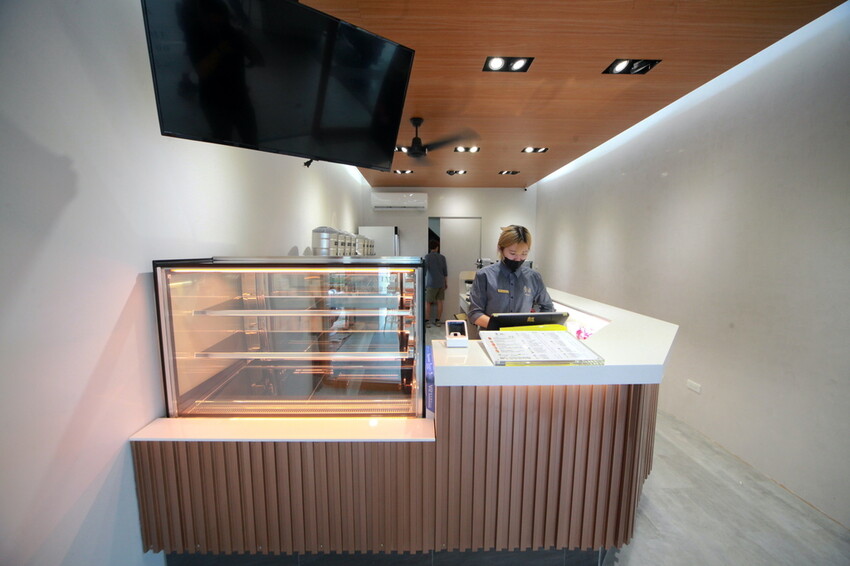 裡面裝潢牆面一面刷白,另外一面牆面補土樣式刷漆,天花板製作大面積木作裝潢,採用接近4000K色溫燈具來打燈,在裡面想拍張美照是很容易的,店面後方有設置三的金色字體,也是適合來拍照打卡與網友分享。