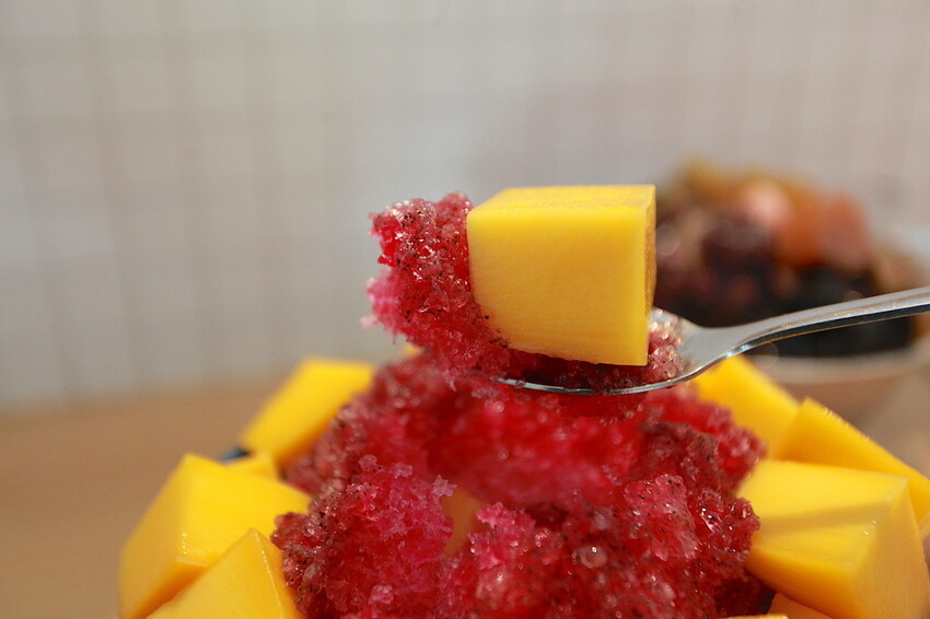 這碗芒果冰室淋上火龍果汁當做榮將,這天然芒果融入再挫冰裡,微甜清涼清爽非常好吃。