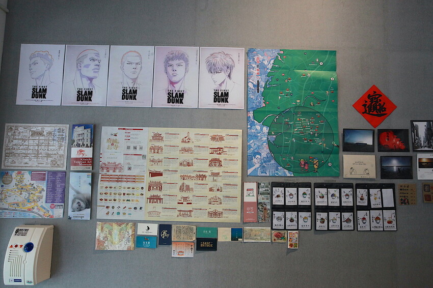 牆面貼上台南地圖旅遊景點介紹供參考,還有一些漫畫人物插畫供欣賞。