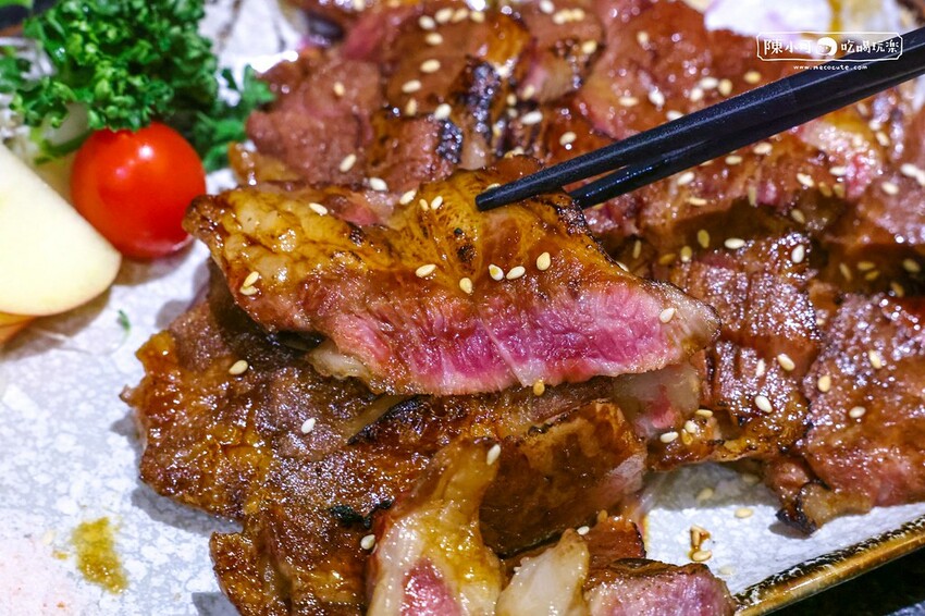 肉厚Q嫩,咬下去好彈好多汁,醬汁和白芝麻的點綴沒有蓋掉牛小排的風味,師傅掌控的火侯功力完美,旁邊新鮮蘋果片和番茄用來解膩,但說實話,這道好下飯,連吃好幾塊都不膩。