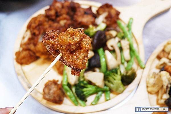 裡面有四季豆、花椰菜、香菇和杏鮑菇,綠色蔬菜炸的時間控制得很好,還保留著鮮綠的色澤,吃起來也保留水份不會太油膩;青菜用炸的多半會吸收較多油脂,在起鍋後多了吸去多餘油脂的步驟,才不會造成身體負擔。