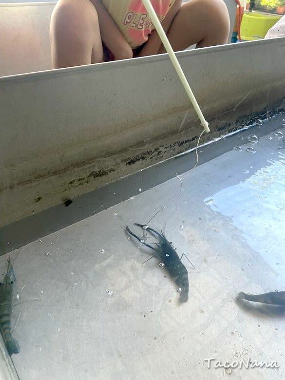 最後我實在看不下去,便出手教學了一番,就是要勾蝦尾或蝦肚子側邊,輕輕鬆鬆就釣起來了!