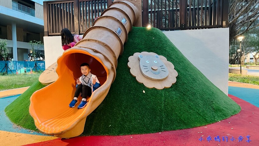 滑梯兩邊有很可愛的獅子頭造型~小孩把綠草當滑草溜~XD