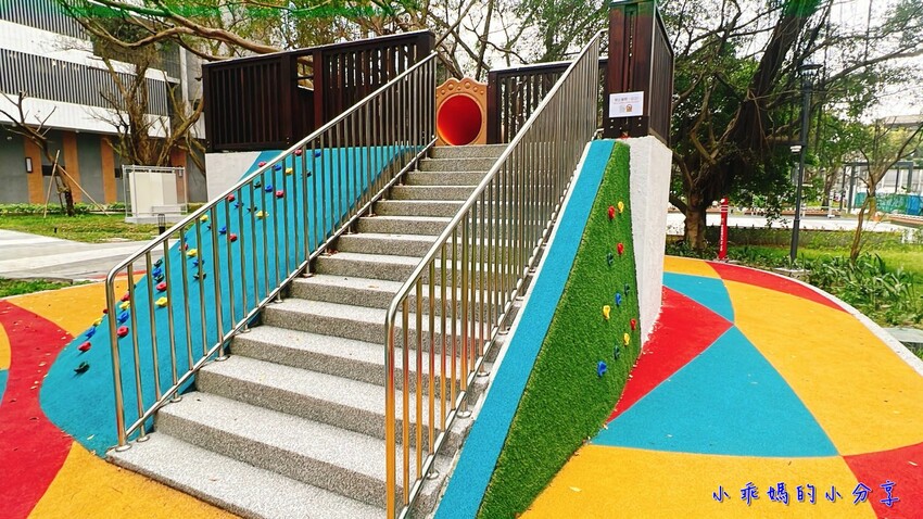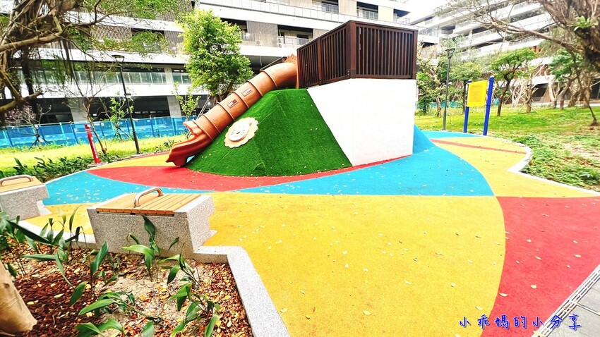 雖然是小小一座的公園,色彩非常鮮艷繽紛,四周也都設有椅子可以讓家長休息,看著孩子玩~