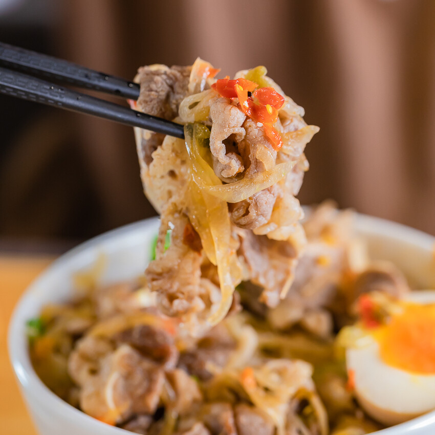 ▲雙椒牛丼是招牌,雙椒就是大紅辣椒加上剝皮辣椒製成,號稱是「最容易下飯的辣椒醬」,對於想吃辣,但又不敢吃太辣的我來說,真的是好物呀!