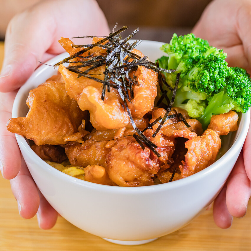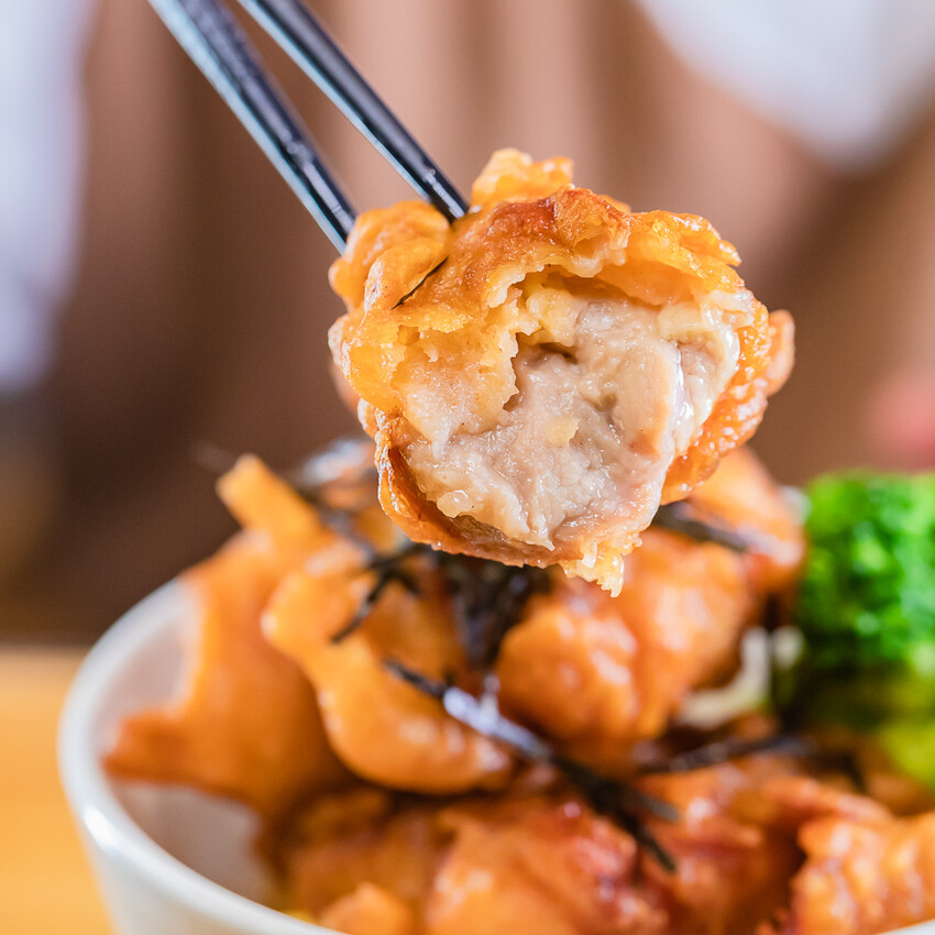 ▲▼扒扒丼的唐揚雞尺寸超大,果然是霸王級別的,咬下去是外層酥脆、裡面的雞肉會爆汁的,口感軟嫩,趁熱吃最好吃,但要小心燙口囉!