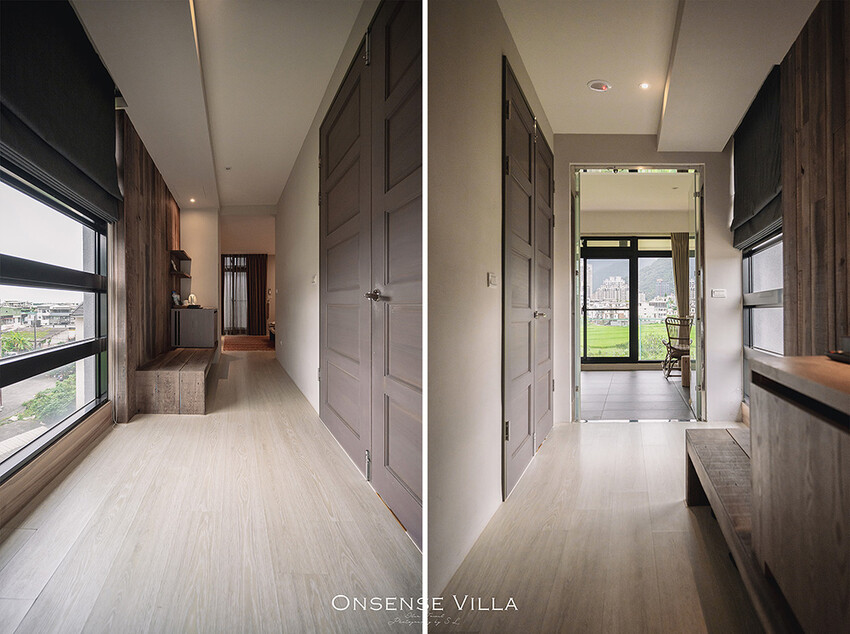 當打開門之後可以看見一條長廊,而這條長廊分別是通往客房的住宿區與淋浴與湯泉的區域。長廊空間的木櫃部分則是提供各位旅人擺放所攜帶的行李也提供了各位茶水、咖啡及冰箱可享用的飲品。